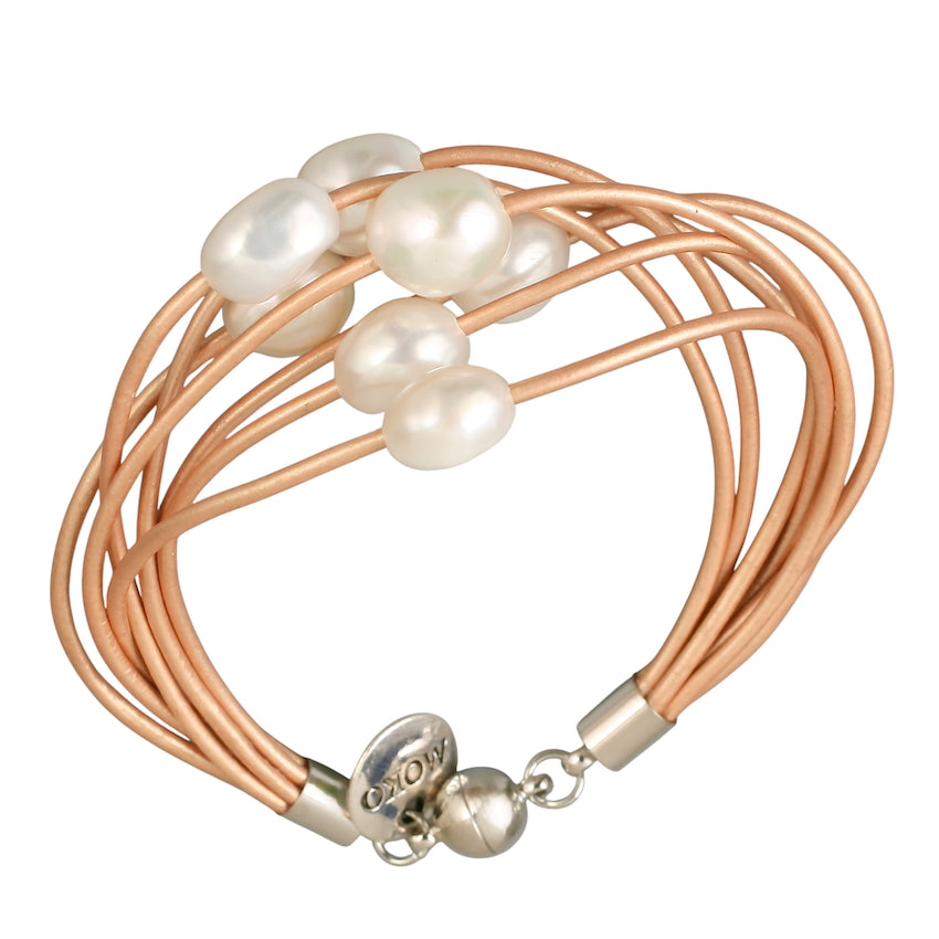 Lola Leather - Pearl Bracelet. 7 strand leather bracelet, with 10mm freshwater pearls. Magnetic clasp. Length 19cm. Ideal for everyday wear.