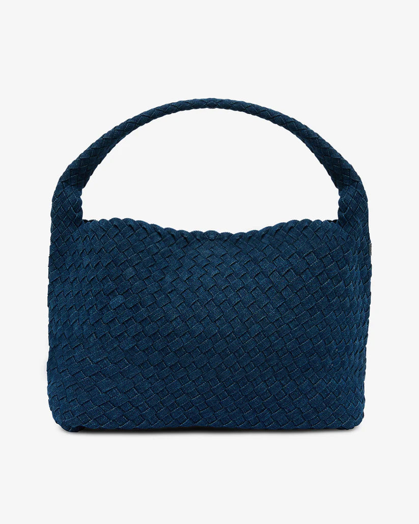 The Arcadia Tote in Denim Plait is crafted from 100% cotton denim in a hand-plaited texture, offering a relaxed yet elevated look. Designed with classic hobo styling, this tote features a spacious interior secured with a top-mounted magnetic closure, opening to reveal an ample central compartment, perfect for everyday essentials.