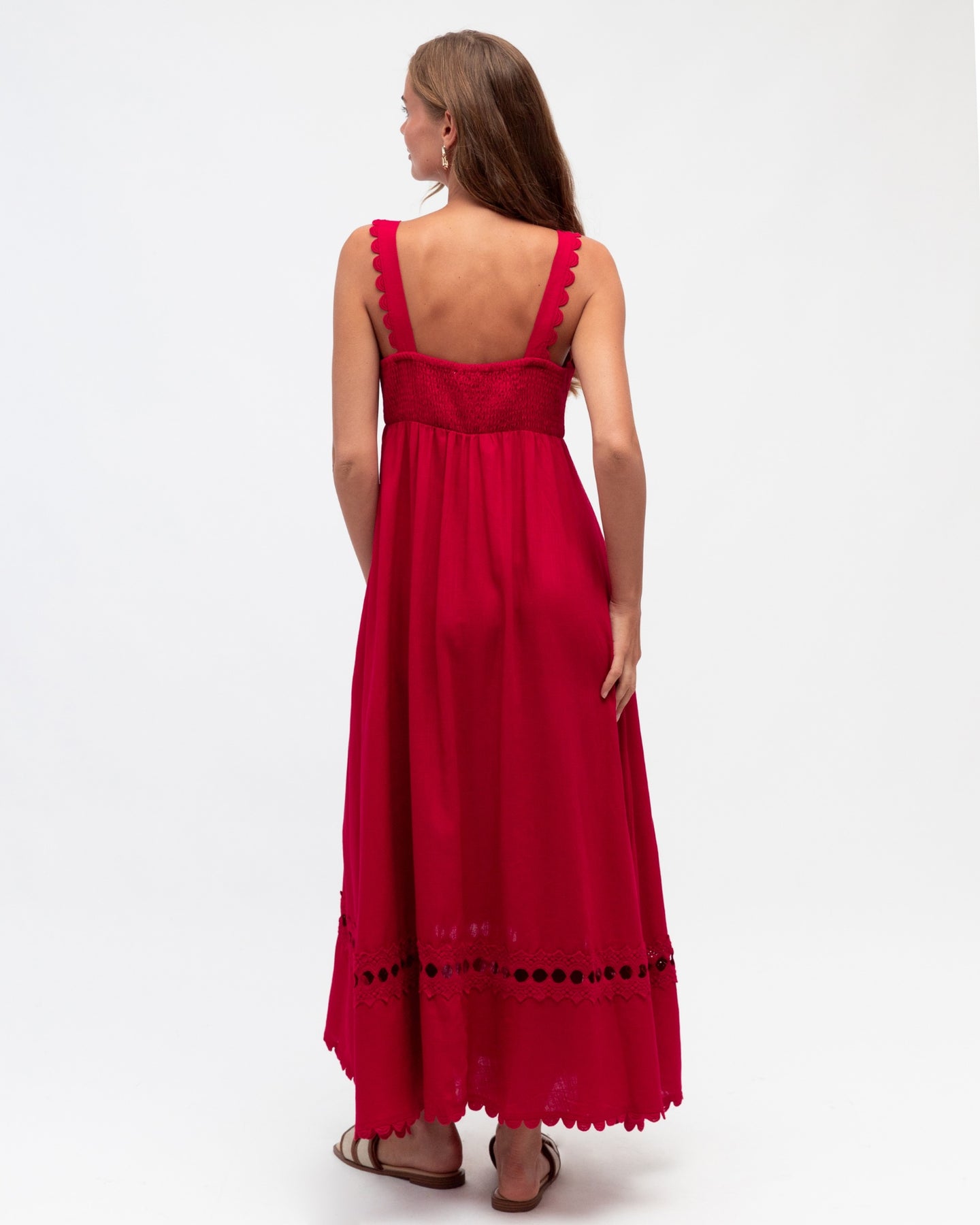 Featuring a scallop detail and lave insert detail in skirt. made from a rayon/linen blend.