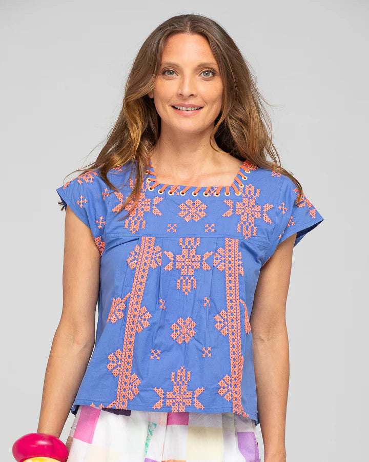 100% cotton, contrast lime embroidery on deep blue base, laced eyelette detail on neckline, cap sleeves.