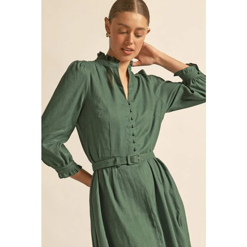 Three-quarter sleeves finished with a ruffle trimmed cuff for refined detailing