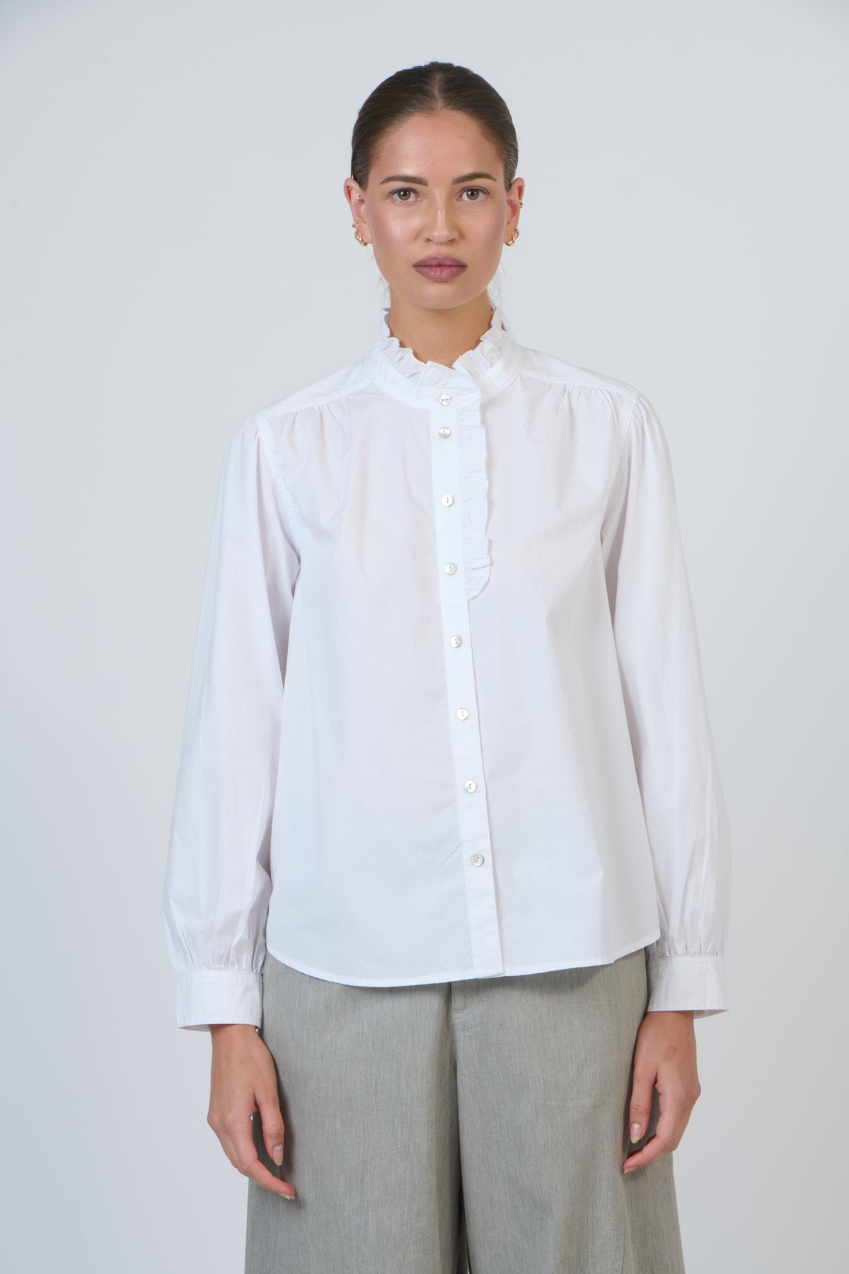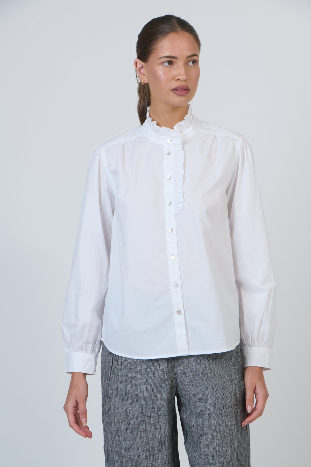 Romantic and effortlessly graceful, GA653 brings a touch of vintage refinement to everyday dressing. The high ruffled collar and softly gathered yoke create a delicate silhouette, complemented by voluminous sleeves that finish in tailored buttoned cuffs. Its relaxed, hip-length shape drapes beautifully in breathable 100% poplin โ€” an elegant nod to Victorian-inspired femininity reimagined for the modern wardrobe.