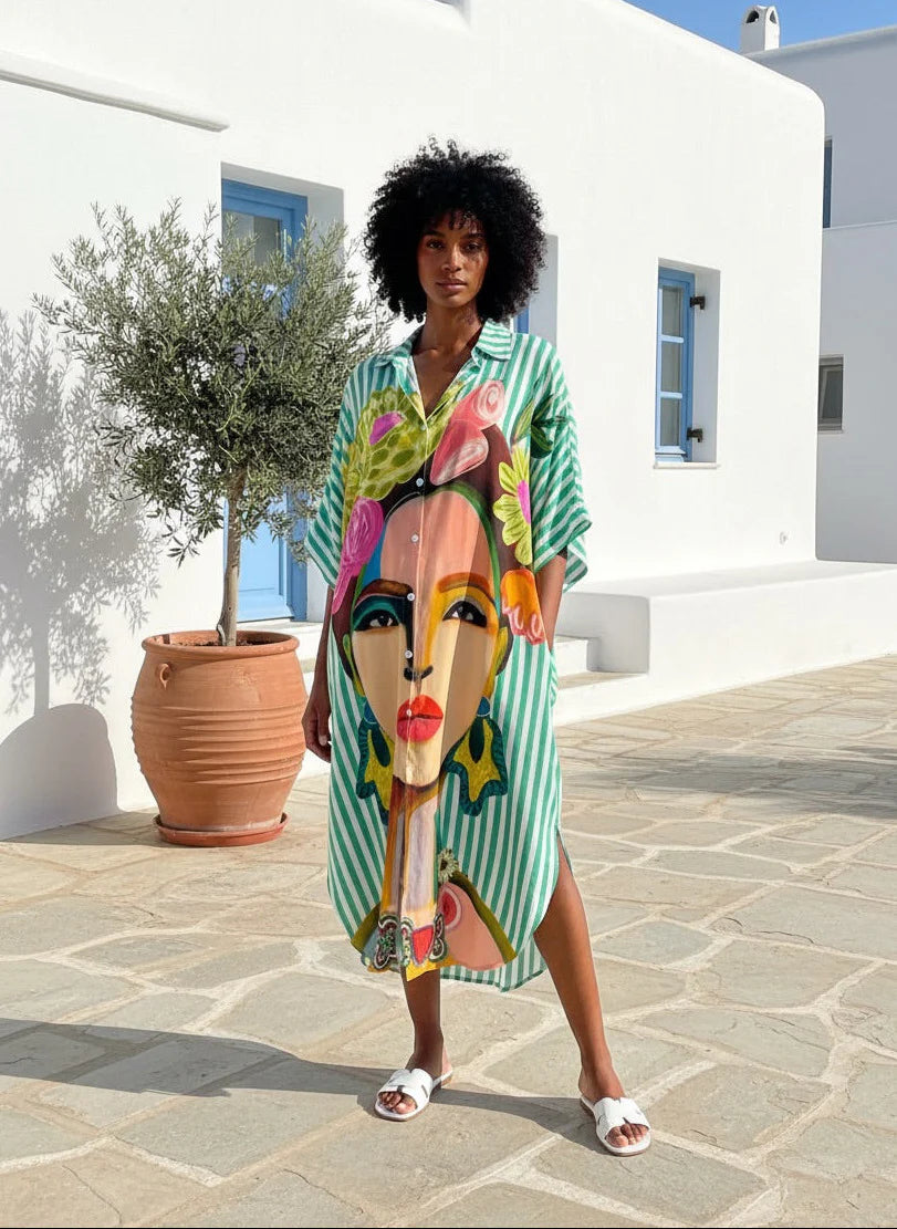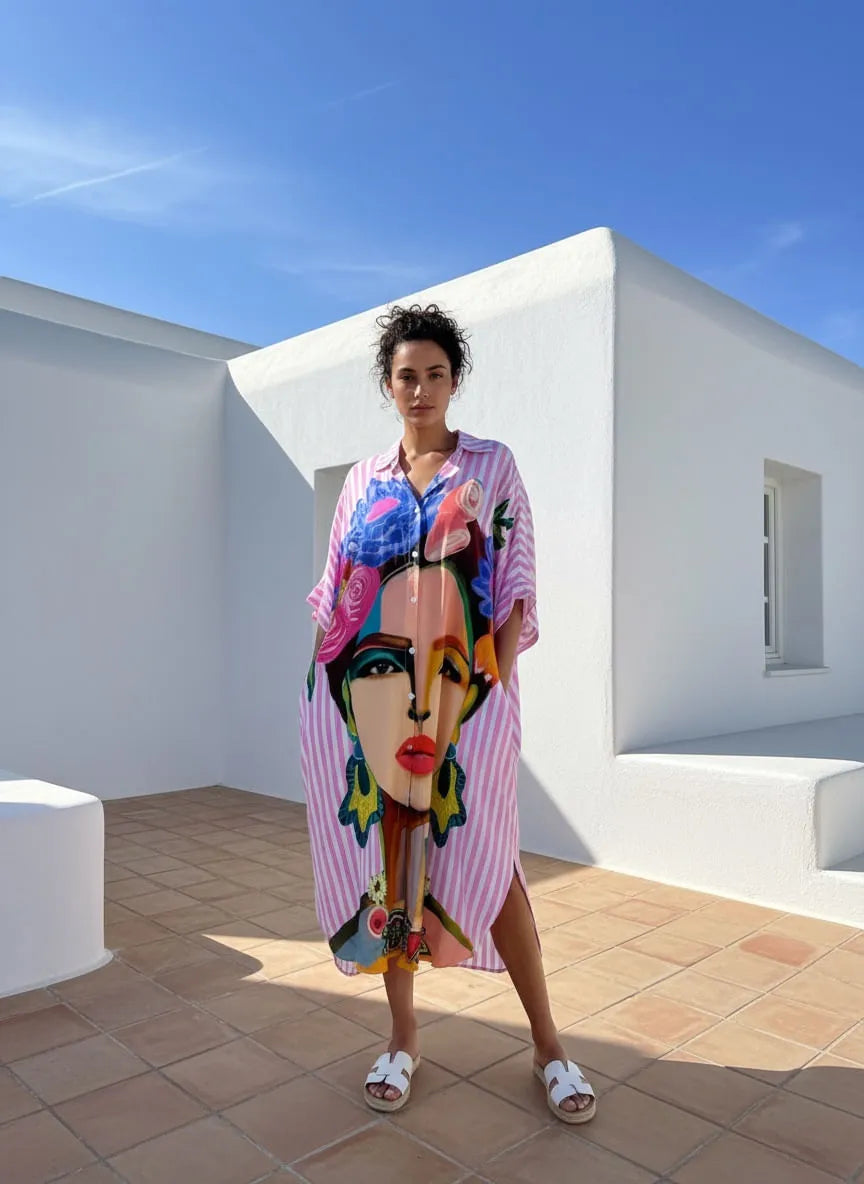 Make a bold statement with this eye-catching shirt dress, crafted from 100% lightweight rayon for an effortlessly soft and breathable feel. Featuring an exclusive oversized artistic print paired with subtle vertical stripes, this piece is designed to stand out in any resort, holidays, and casual days